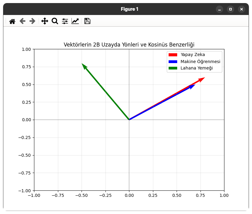 plt.title("Vektörlerin 2B Uzayda Yönleri ve Kosinüs Benzerliği")